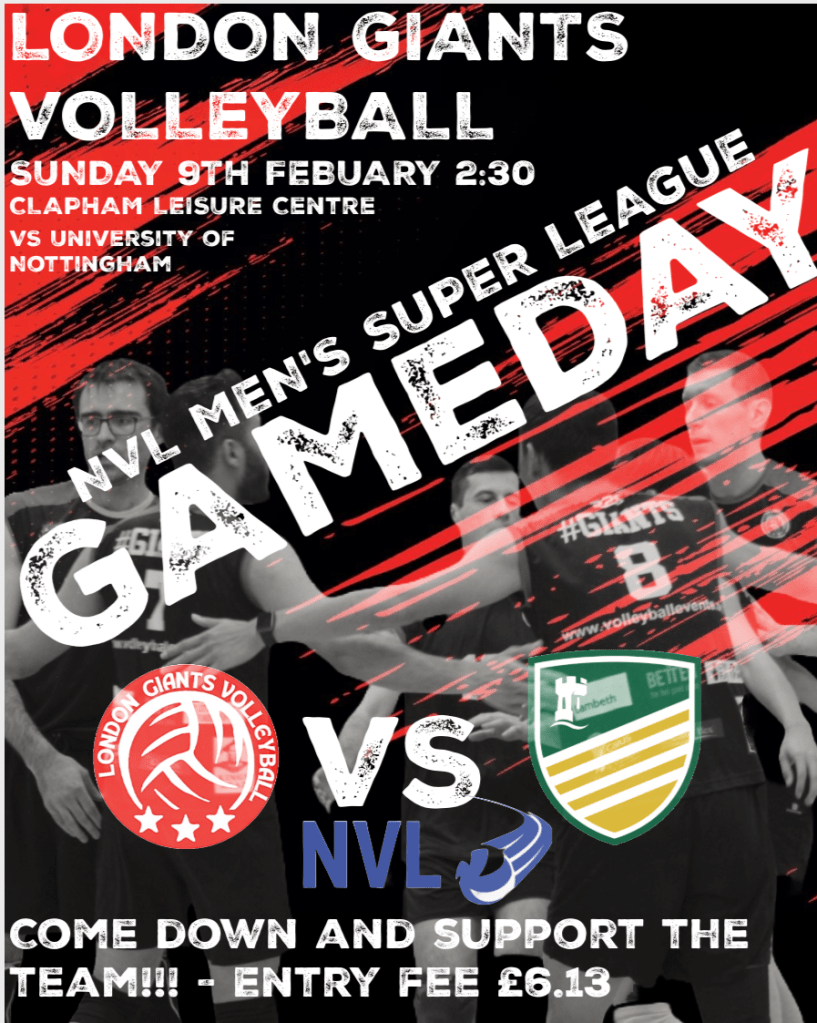 London Giants vs University of Nottingham Volleyball Sunday 9th February 2:30 Clapham Leisure Centre Entry Fee: £6.13